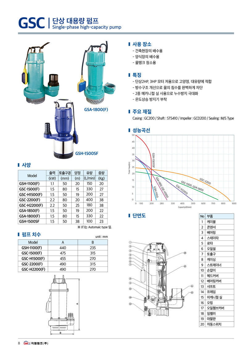 * 단상 2HP, 3HP 모터 저용으로 고양정, 대용량에 적합